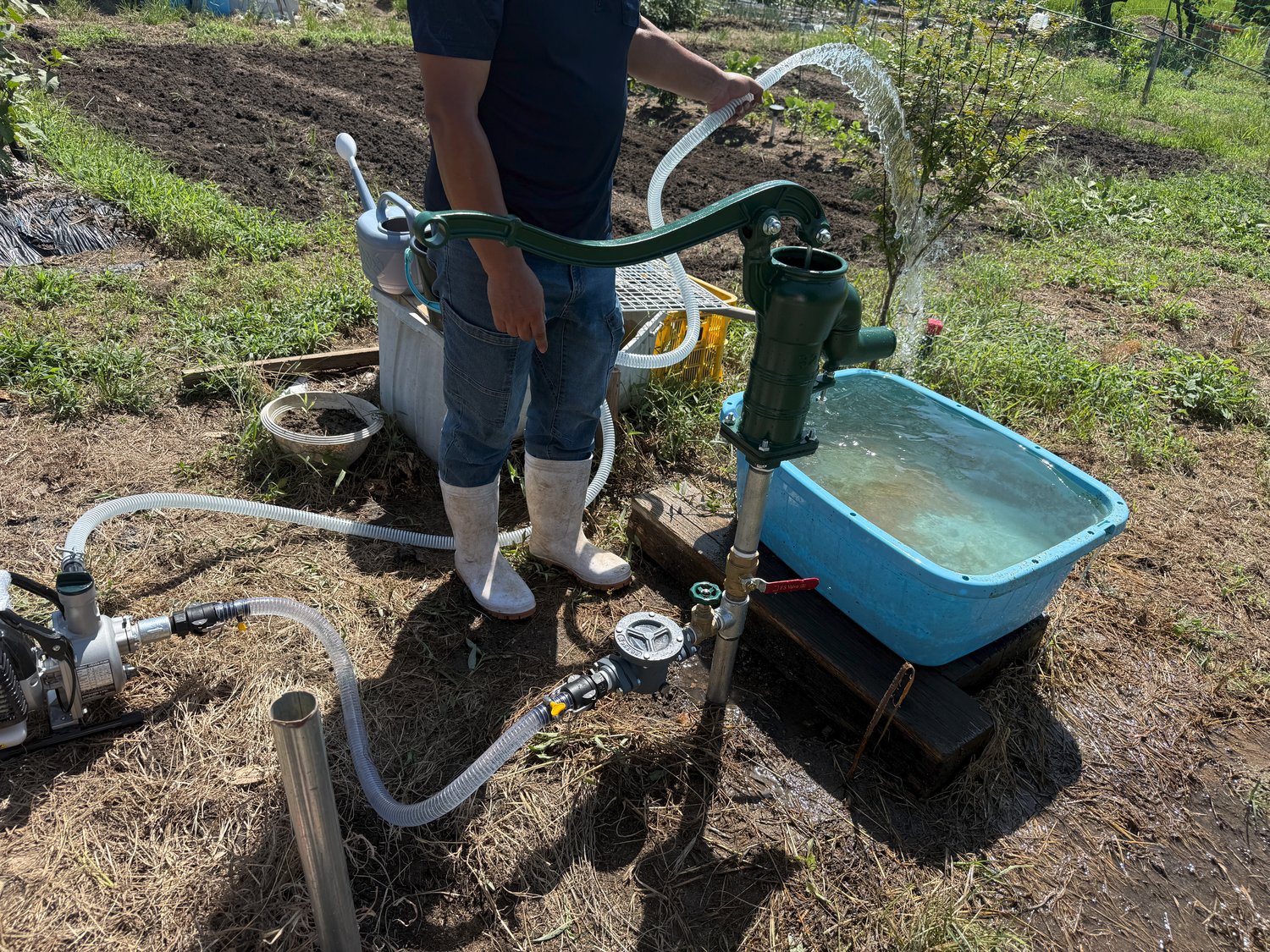 三ヶ月前に井戸をつくったお客様から突然のお電話。内容をお聞きすると菜園の野菜に水やりしようとしたが水が出なくて困っているとのお話。こちらのお客様はポンプは自分でするから井戸だけつくって欲しいとのご要望でした。さっそくお伺いして拝見したところ、ガチャポンのようで実はガチャポンで無い手押しポンプが取りつけてありました。上から除くと猛暑の影響もあるものの内部が残念な状態になっていました。いくら猛暑とはいえたった三ヶ月で・・・ うーん、なんともなエセポンプ。