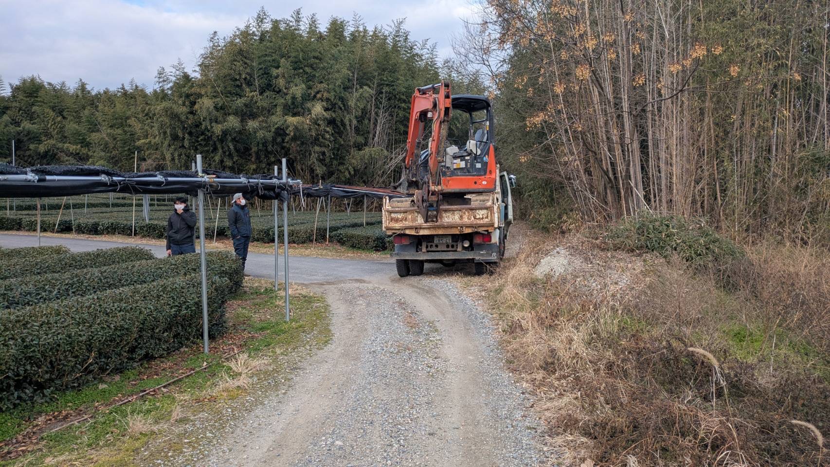 電気も水道もない茶畑。軽トラに発電機と水を積んで現場へ乗り込みます。