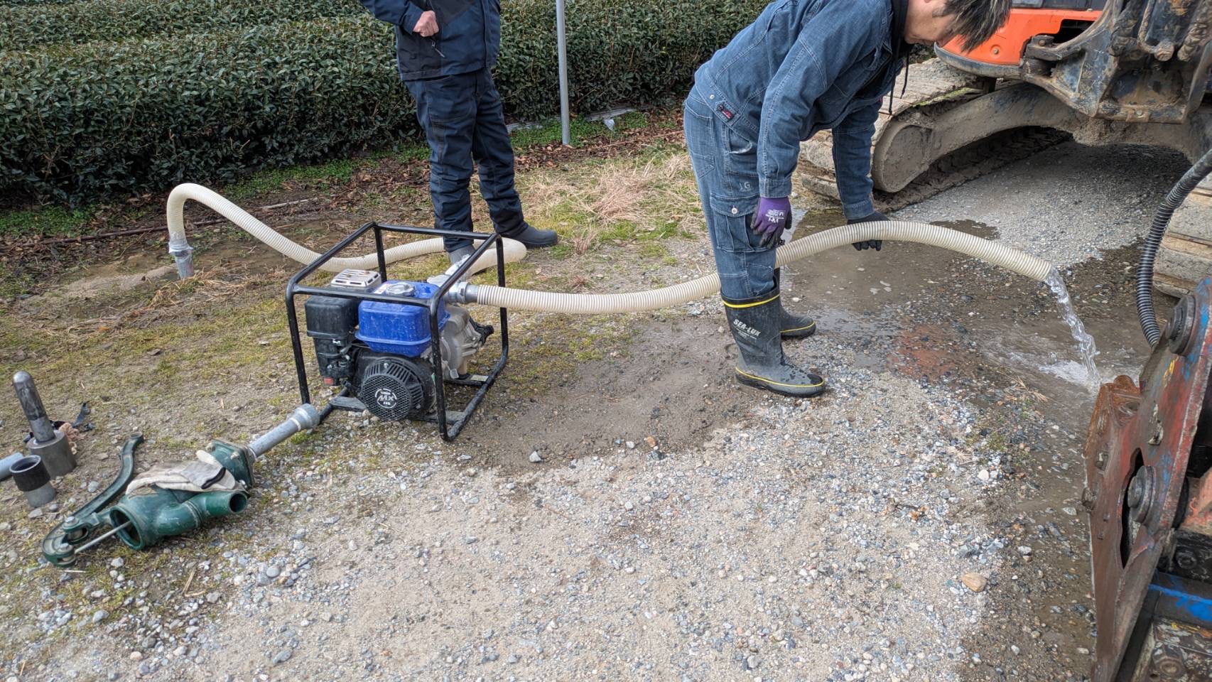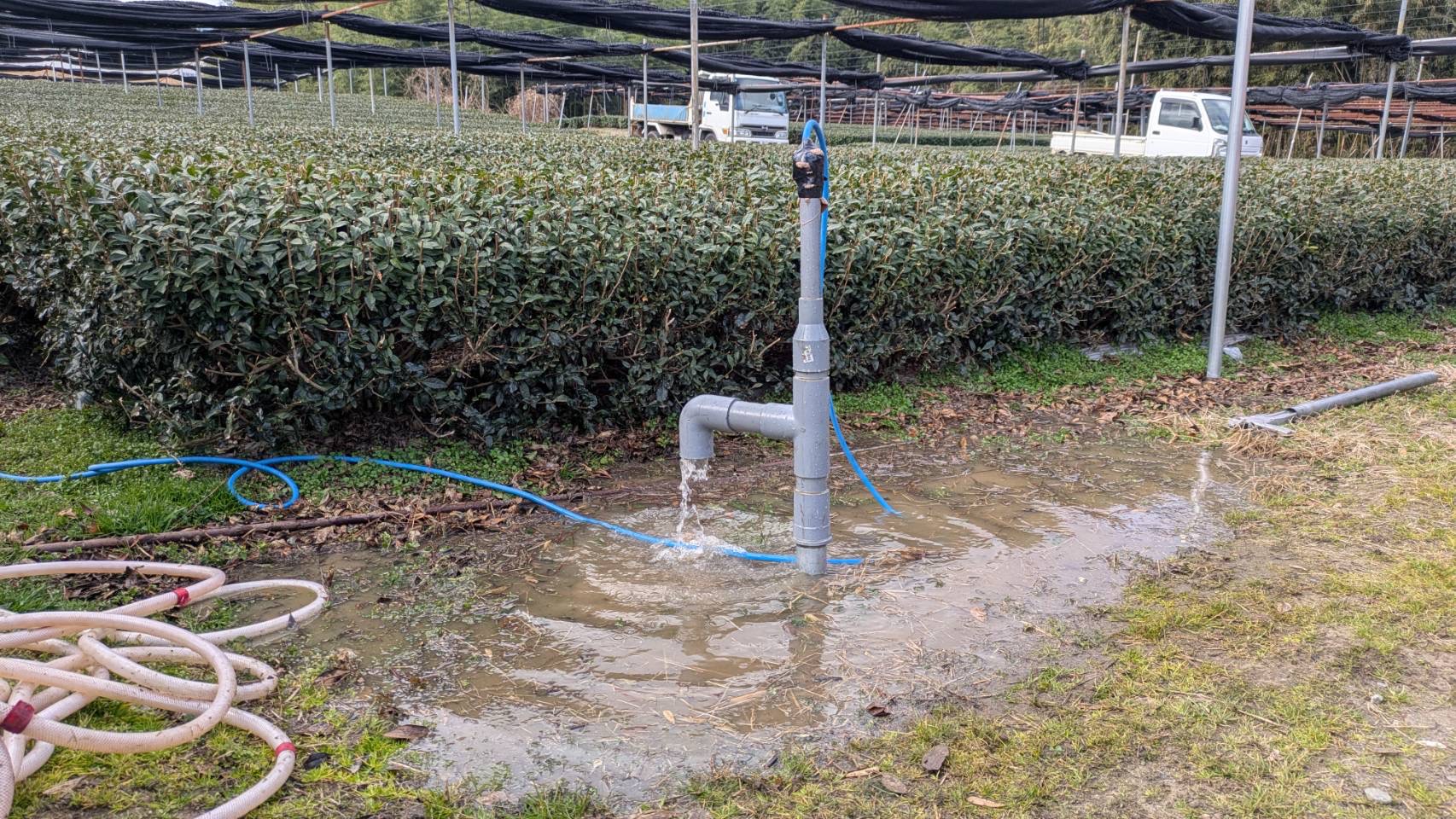 園主様は、この井戸の水を100mのホースで散水し、お茶畑を冷やされます。美味しい宇治茶のために、残り6箇所の工事も頑張ります!